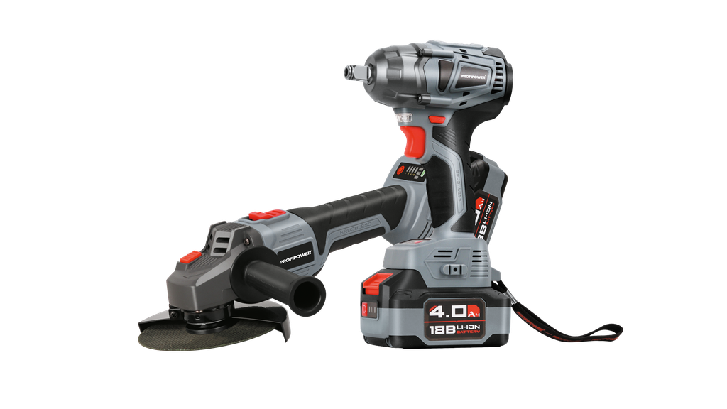 Аккум. бесщеточный НАБОР 2в1 УШМ и ударный гайковерт (аккум. 2шт 18В, Li-ion, 4.0Ач, З/У)