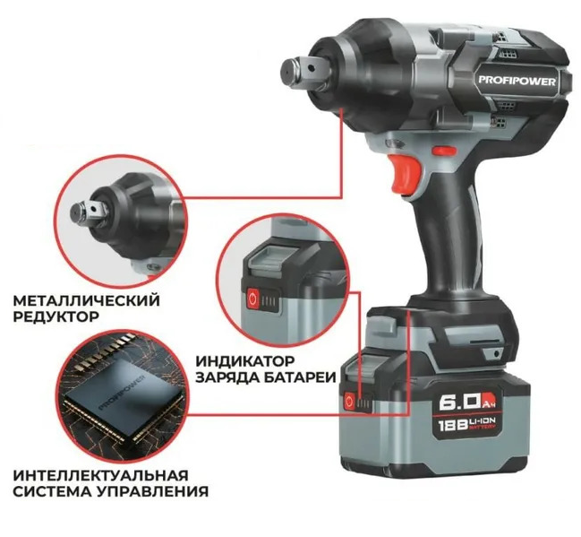 Гайковерт оснащен мощным литий-ионным аккумулятором емкостью 6.0 Ач т, который позволяет работать без перезарядки до 10 часов подряд при частоте вращения шпинделя от 0 до 1800 об/мин. Это делает его идеальным выбором для долговременной работы в условиях недостатка электроснабжения.