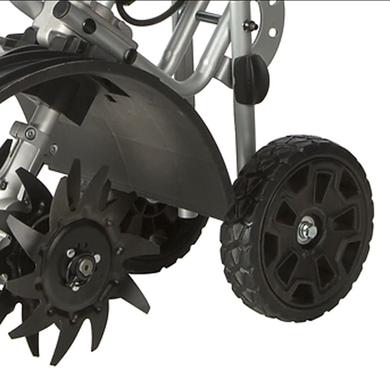 Для удобства использования культиватор оснащен опорными колесами и эргономичной складной ручкой. Благодаря своему легкому весу и компактным размерам достаточно манёвренен и прост в использовании. Имеет-кнопку предохранитель от случайного включения.