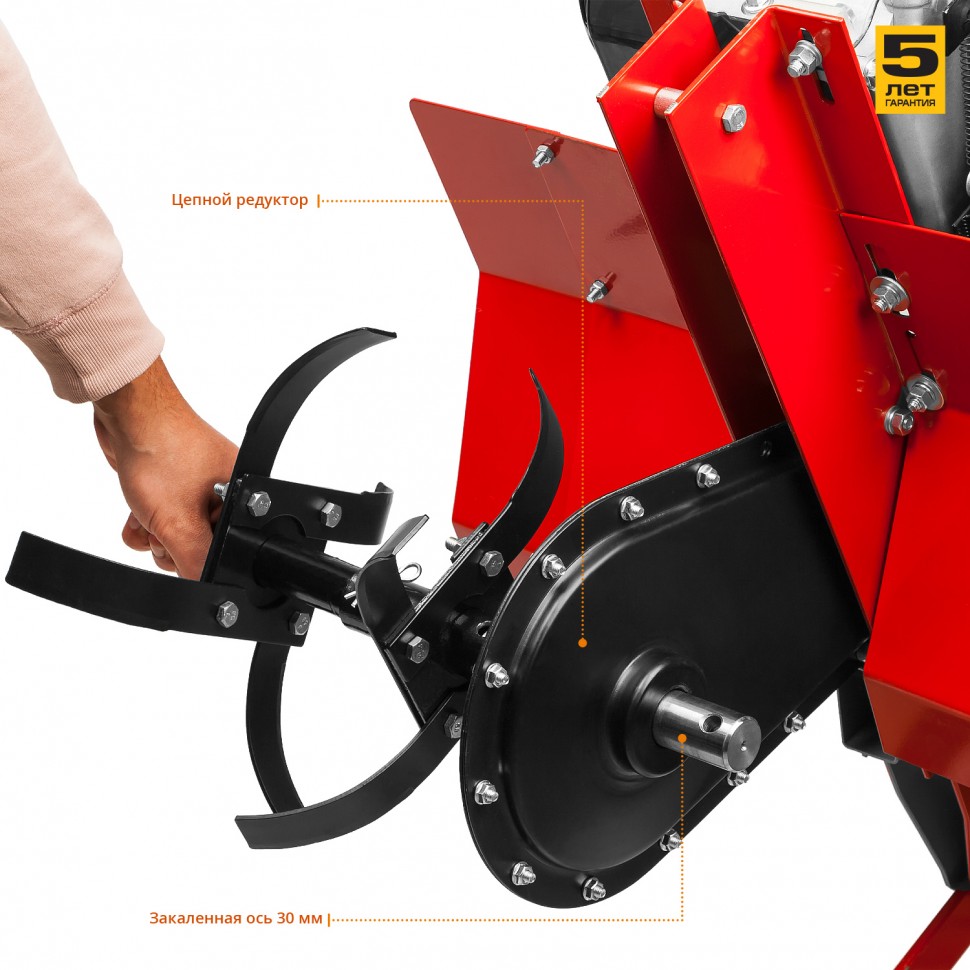 Надёжность. Цепной редуктор и закалённые фрезы выдержат нагрузки даже на плотных почвах.