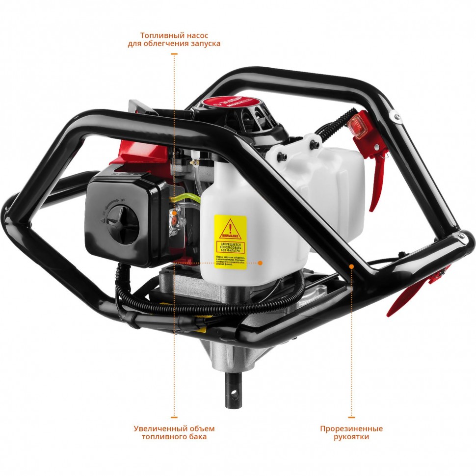 Мощь под капотом. Двухтактный бензиновый двигатель (3,26 л. с. / 2,4 кВт, объём — 71 см³) тянет как надо. Частота вращения — 8 800 об/мин: бурит ровно, без провалов. С таким мотором не страшно взяться за скважину или столбы для забора.