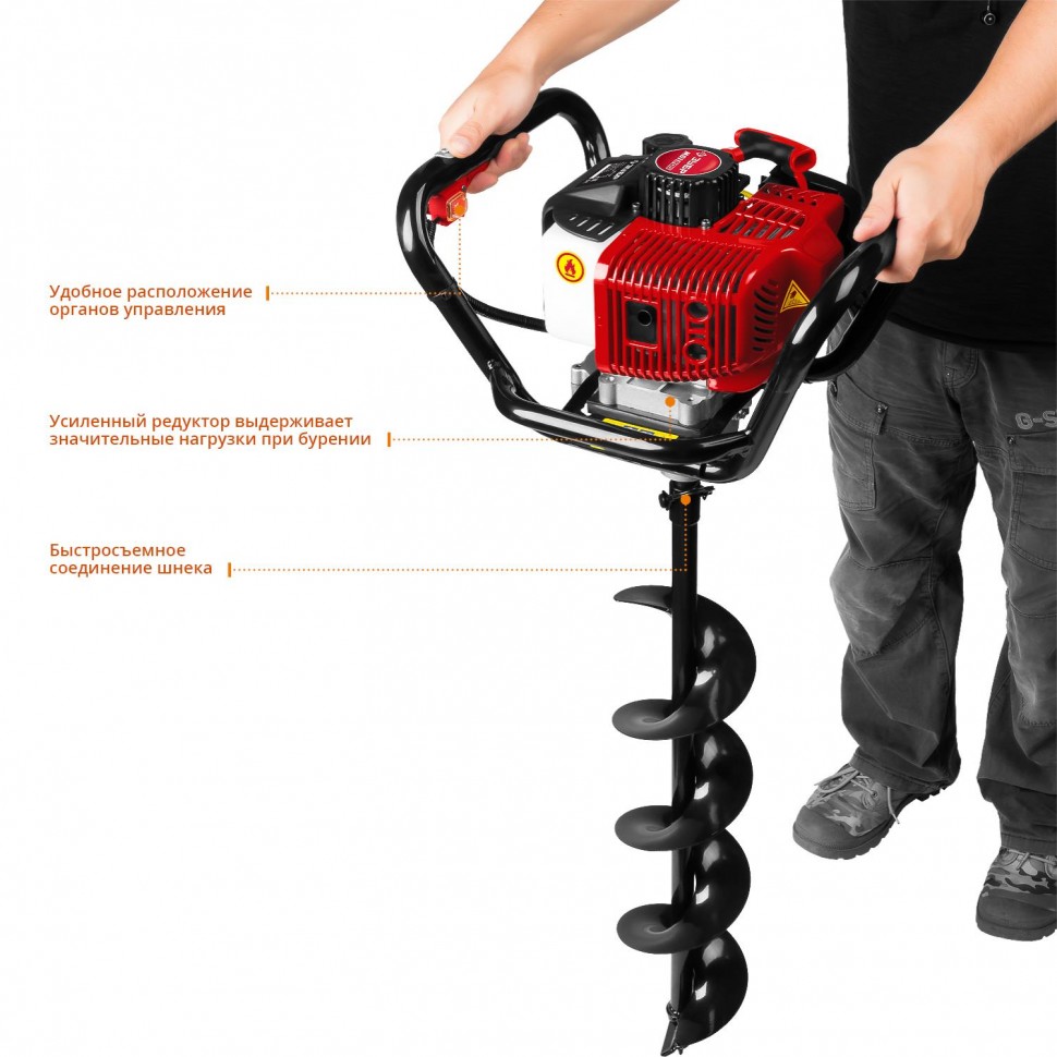Двигатель — зверь: 2,45 л. с. (1,8 кВт), 2‑тактный, объём 52 см³. Бурит всё: мягкий грунт, твёрдый, мёрзлый, лёд. Никаких «не получилось».