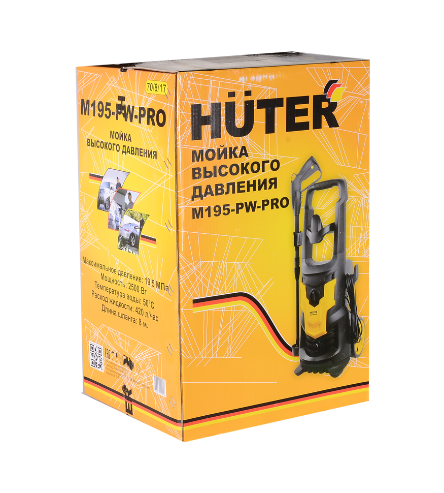 Модель Huter M195-PW-PRO имеет синхронный щёточный двигатель мощностью 2500 Вт. с воздушной системой охлаждения. Рабочее давление мойки - 130 бар, максимальное - 195 бар. Средний расход воды составляет 420 литров в час.