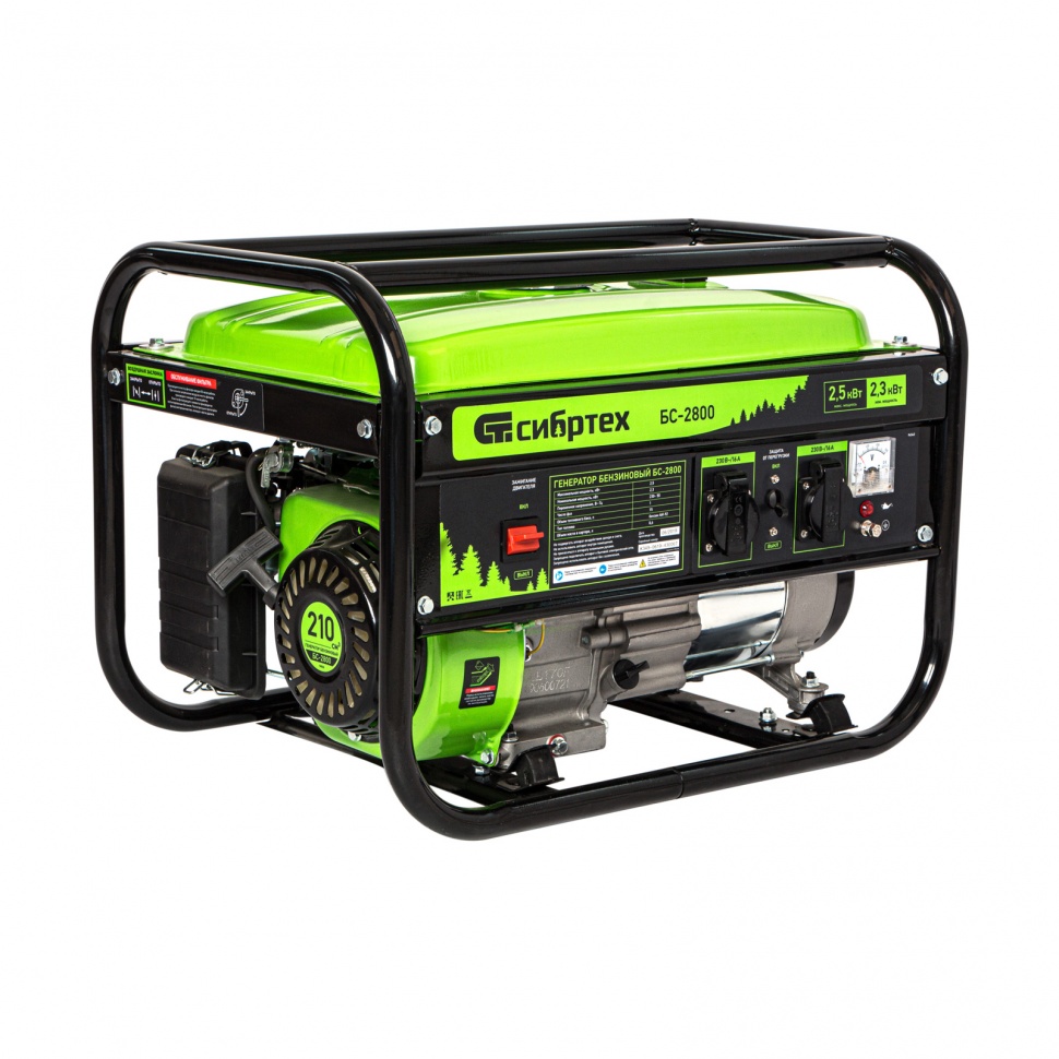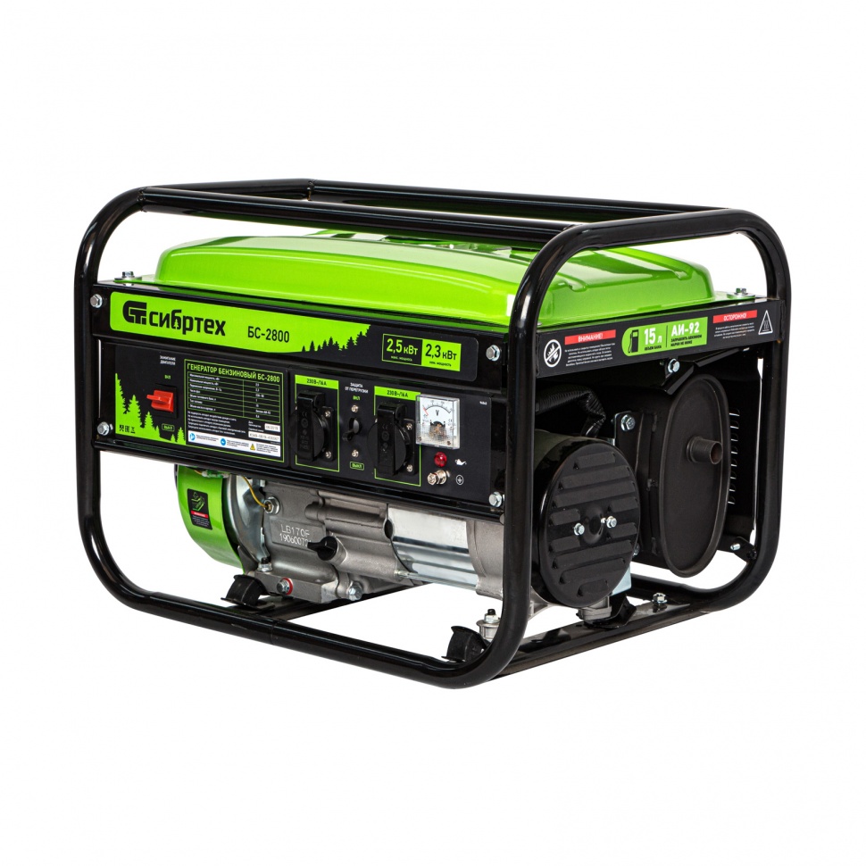 Бензиновый генератор Сибртех БС-2800 отлично подойдет для использования на даче, в гараже, мастерской или на стройке. Небольшой вес 37,6 кг позволяет брать генератор с собой на выездные работы или на природу. Мощности 2,5 кВт достаточно для одновременного подключения: 2 ламп накаливания, холодильника, СВЧ-печи и телевизора. Также к нему можно подключить сразу несколько инструментов за счет наличия 2 розеток. Полный бак обеспечивает работу до 12 часов без дозаправки.