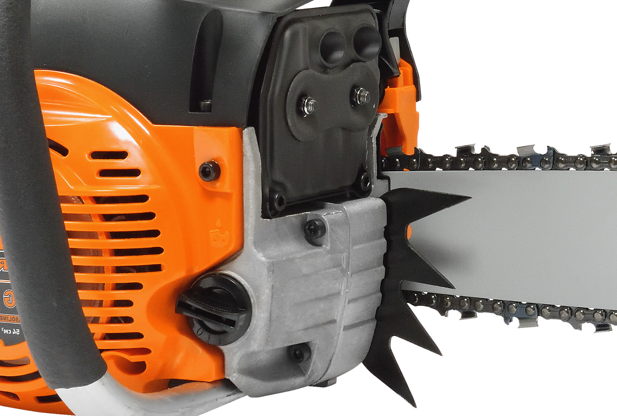 Объём двигателя 54 см³ — мотор не из слабых: тянет уверенно, не задыхается на толстых брёвнах.