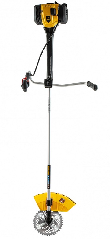 В комплект входит набор оснастки: полуавтоматическая катушка с системой Easy Load, трехлопастной нож и пильный диск, что позволяет обрабатывать газон, скашивать высокую траву, мелкий кустарник и побеги деревьев
