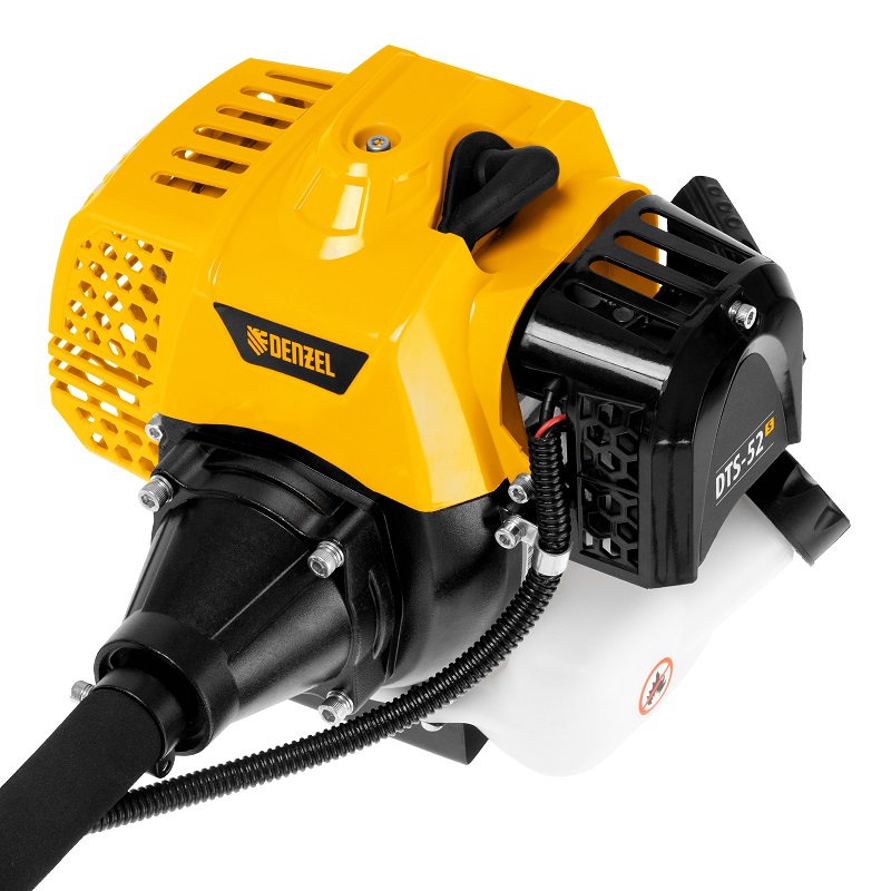 Триммер бензиновый Denzel DTS-52S с двигателем объемом 52 куб. см и разъемной штангой (состоит из 2 частей), используется для скашивания травы любой густоты, выравнивания кромок газонов, избавления от сорняков и растительности с толстыми стеблями