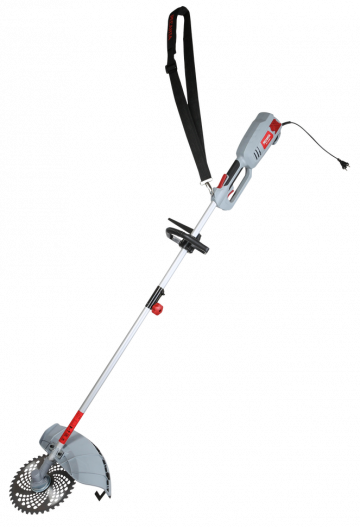 Ширина полосы обработки за один проход составляет 42 см. Возможна установка разных типов насадок: леска (2 мм) для выравнивания газонов или диск 40TR с твердосплавными победитовыми напайками для удаления мелкой поросли кустарников. D-образная ручка облегчает маневрирование на клумбах и участках, где много препятствий. Электротриммер укомплектован ремнем на плечо. Его можно заменить на ранцевый, который равномернее распределяет нагрузку.