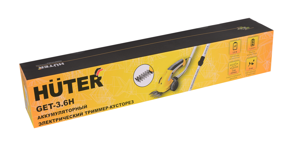 Huter GET-3,6H — триммер-кусторез, работающий от литиевого аккумулятора емкостью 1,5 Ач. С помощью аккумуляторного кустореза вы сможете легко формировать кусты на дачном участке. Устройство способно справляться с ветками толщиной до 8 мм. Частота вращения двигателя составляет 1100 об/мин. Эта характеристика триммера-кустореза напрямую влияет на то, насколько легко он будет справляться с травой и ветками.