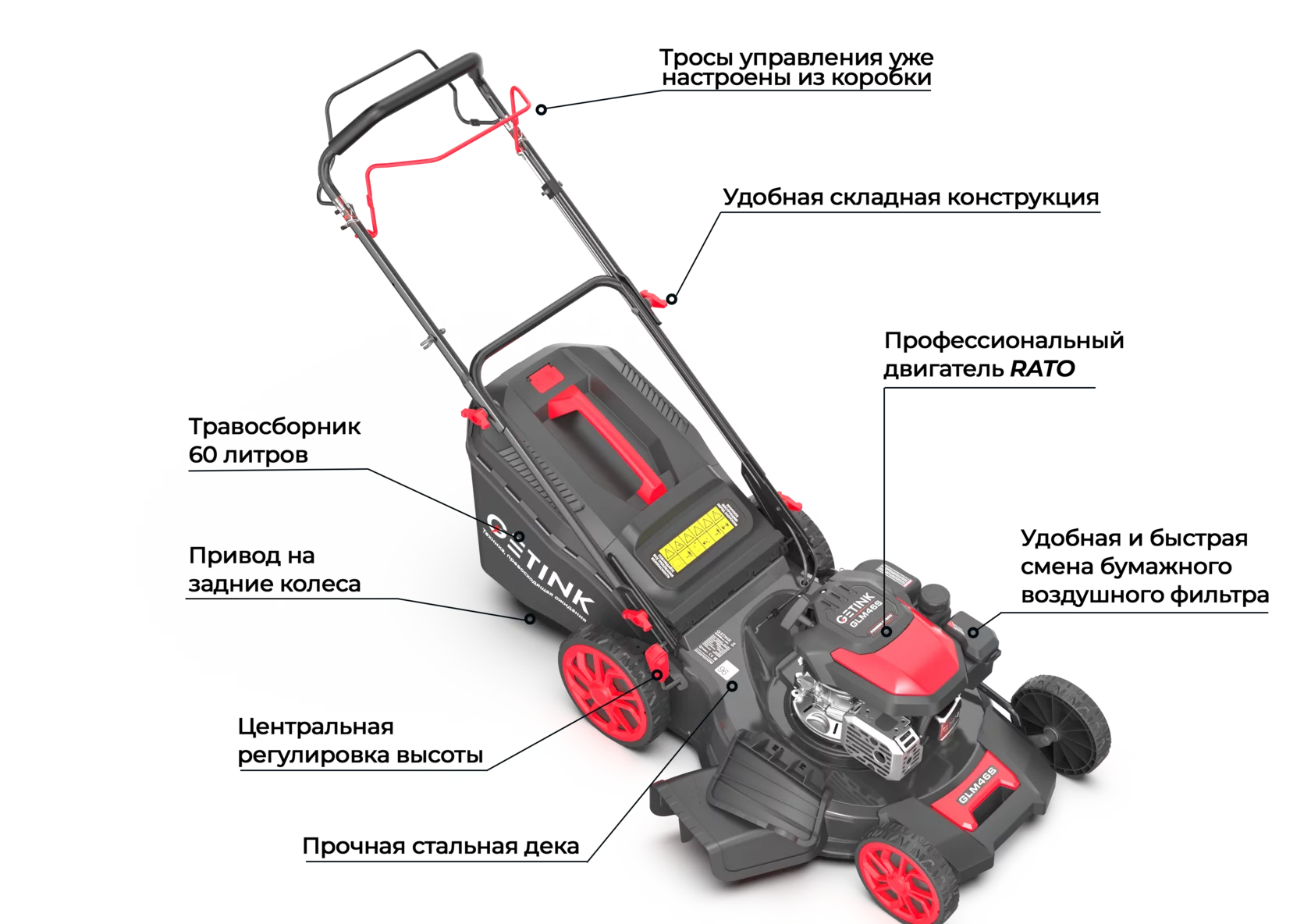 Газонокосилки GETINK построены на базе бензиновых моторов от мирового лидера производителя CHONGQING RATO, которые обеспечивают стабильный запуск и длительную беспроблемную эксплуатацию: стабильность работы, технологичность и ресурс моторов CHONGQING RATO на уровне топовых мировых японских и американских брендов.