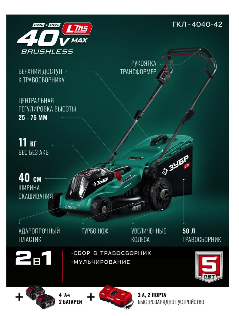 ГКЛ-4040-42 ЗУБР газонокосилка аккумуляторная бесщеточная в Челябинске