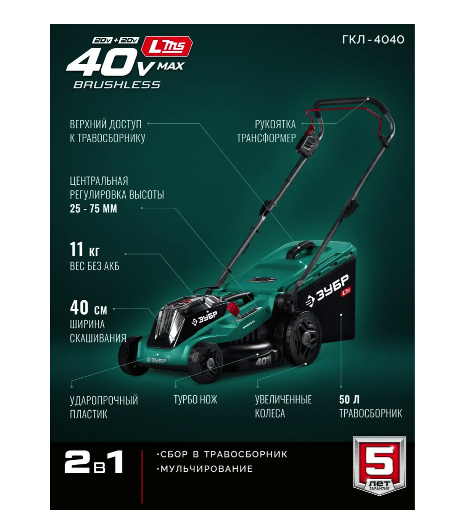 ГКЛ-4040 ЗУБР газонокосилка аккумуляторная бесщеточная в Челябинске