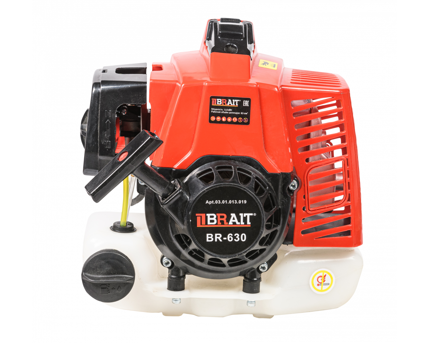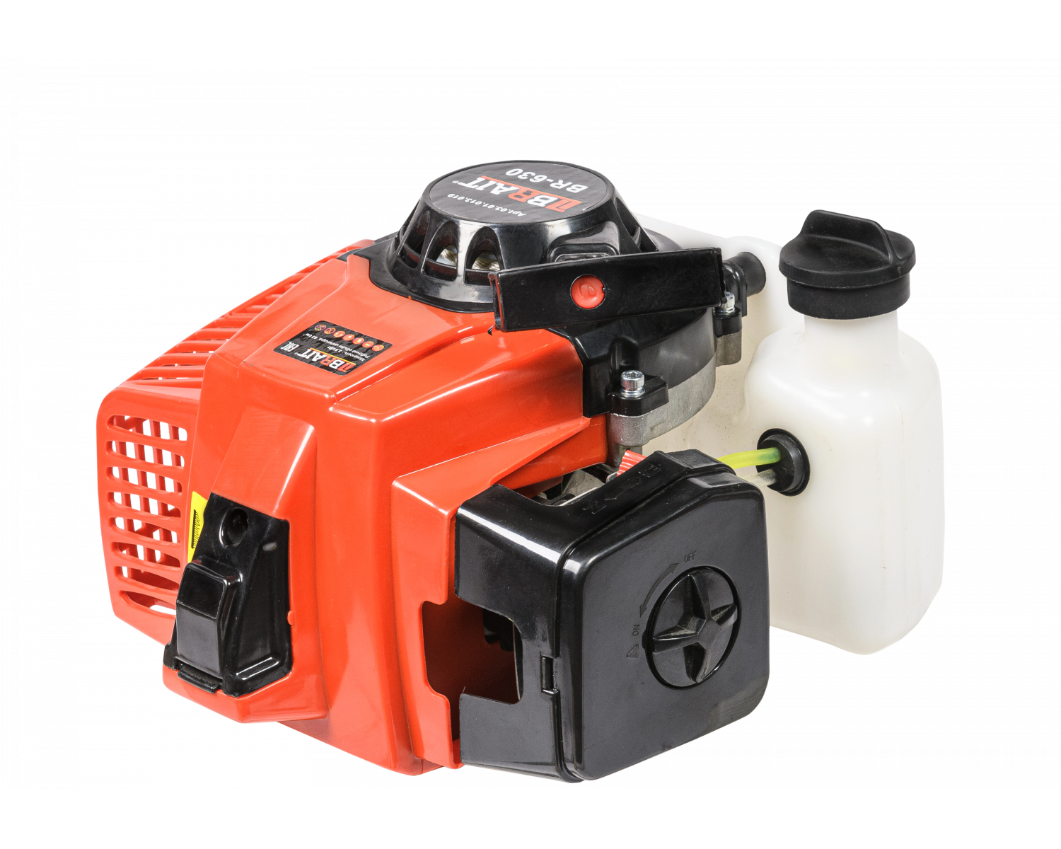 Двигатель бензиновый BRAIT 2х тактный BR-630 – мощная модель двухтактного двигателя. Мотор имеет объем цилиндра в 63 куб.см. Такой объем позволяет выдавать мощность до 4 л.с. Емкость топливного бака 1,4л. Пластиковый топливный бак защищен стальной опорной пластиной. В бак заправляется смесь (бензин АИ-92+масло для 2-тактных двигателей). Благодаря небольшому количеству масла в смеси, она легко выгорает, предотвращая залипание поршневых колец. Запуск производится продергиванием шнура кик-стартера. Для простоты запуска непрогретого мотора, есть воздушная заслонка, при помощи которой можно контролировать объем подачи топлива в камеру сгорания.
