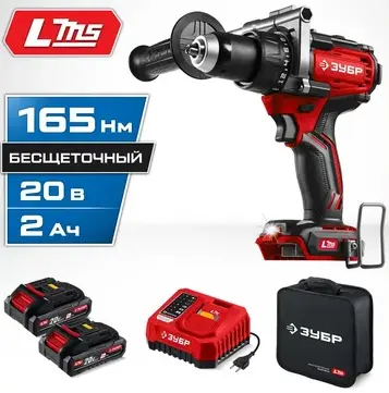 ЗУБР 20 В, 165 Н·м, 2 АКБ LMS (2 А·ч), бесщеточная ударная дрель-шуруповерт, сумка (ДБУ-165-22)