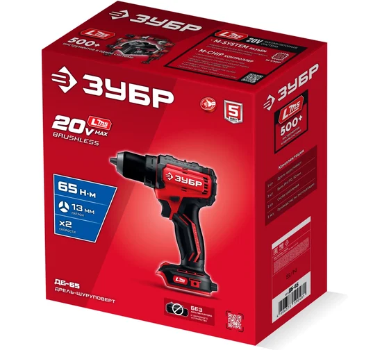 ЗУБР 20 В, 65 Н·м, без АКБ (LMS), бесщеточная дрель-шуруповерт (ДБ-65)