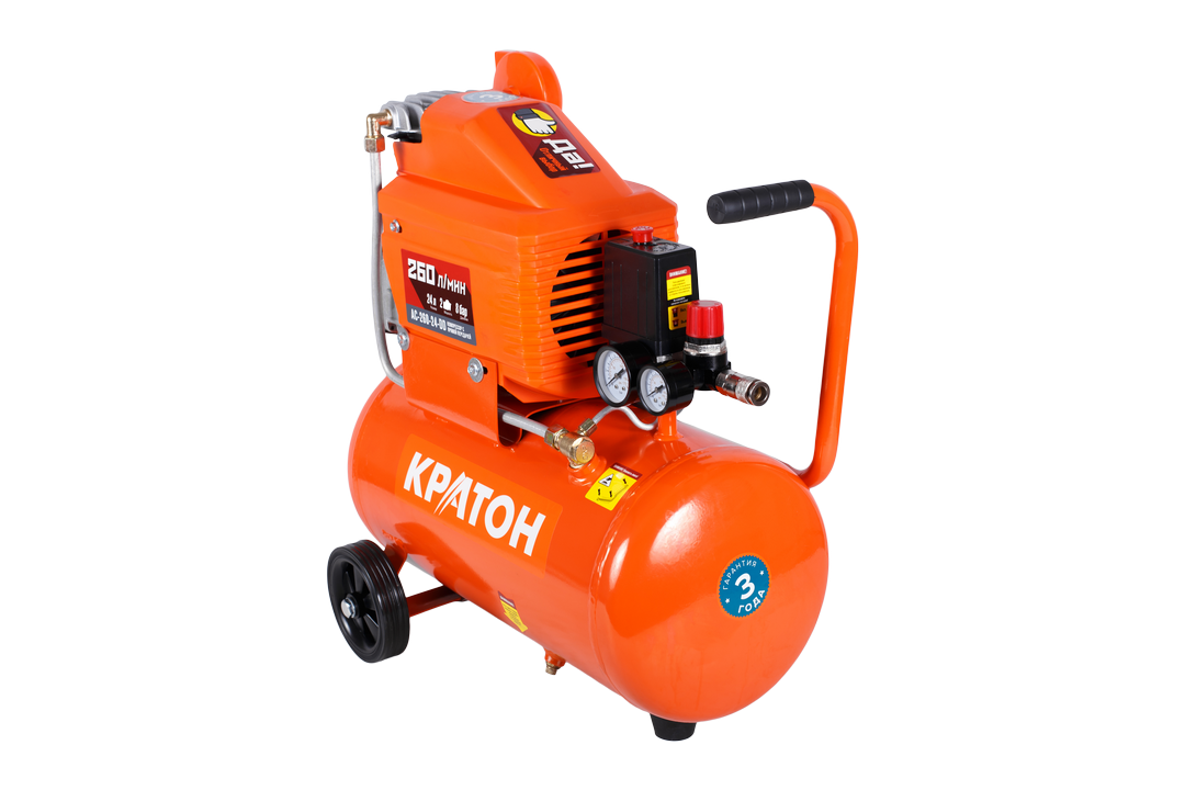 Масляный компрессор с прямой передачей бренда Кратон AC-260-24-DD имеет компактные размеры. Для перемещения на небольшие расстояния компрессор комплектуется рукояткой и двумя колесами. Инструмент оснащен предохранительным клапаном для ограничения максимального давления сжатого воздуха в ресивере и защиты его от разрушений и перегрузок.