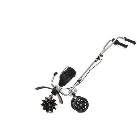 Для удобства использования культиватор оснащен опорными колесами и эргономичной складной ручкой. Благодаря своему легкому весу и компактным размерам достаточно манёвренен и прост в использовании. Имеет-кнопку предохранитель от случайного включения.