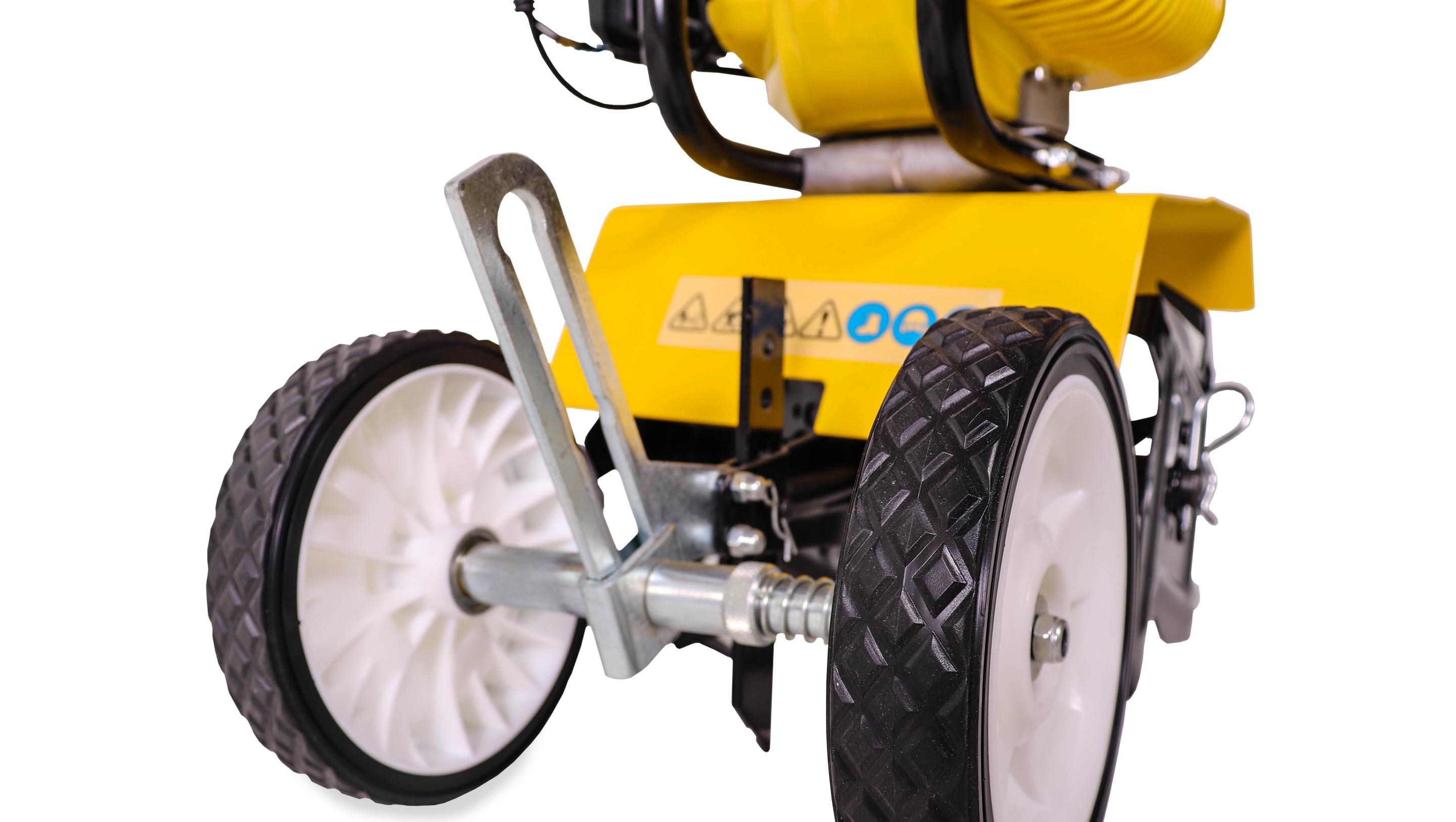 Маневренность в узких пространствах. Компактные габариты (940 × 420 × 910 мм) — работает в теплицах, вокруг деревьев и клумб, не задевая посадки.