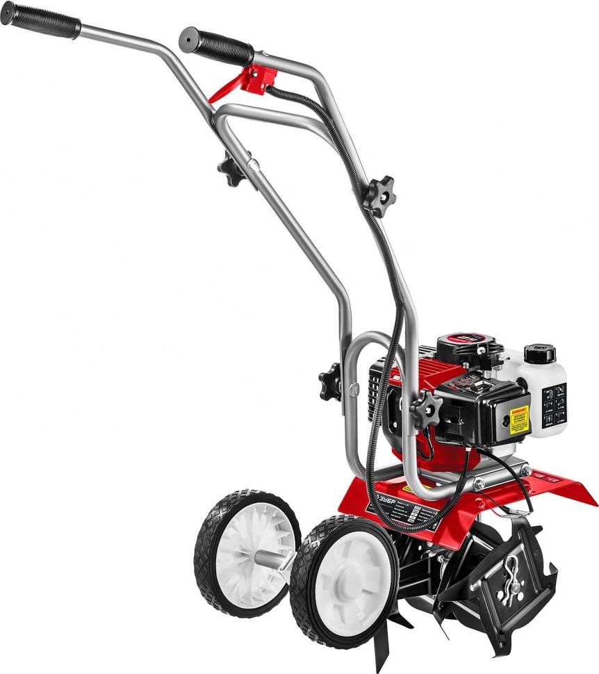 Мощность 2,2 л. с. (1 600 Вт) — двухтактный двигатель ЗУБР готов к работе даже на плотных почвах.