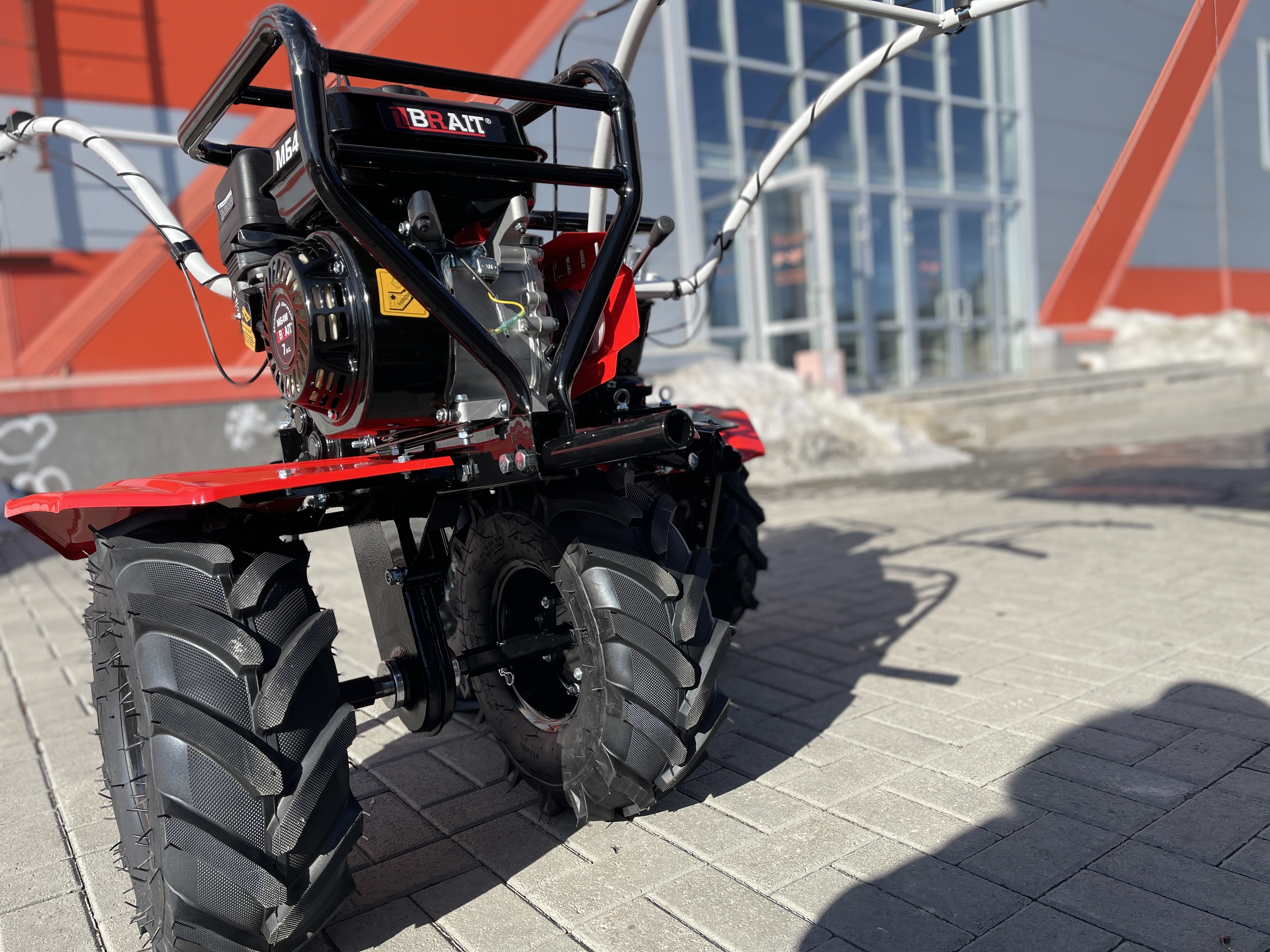 Мотоблок BRAIT МБ4W с пониж, 4впер+2наз (7л.с.)(широкие колеса 19x7x8) с шириной захвата до 90 см, укомплектован прочными фрезами, что позволяет применять его на тяжелых грунтах и для обработки целины. Колеса с агрессивным протектором размером 19x7x8, позволяют работать на любых видах грунта, и использовать его совместно с телегой для перевозки грузов до 500кг !