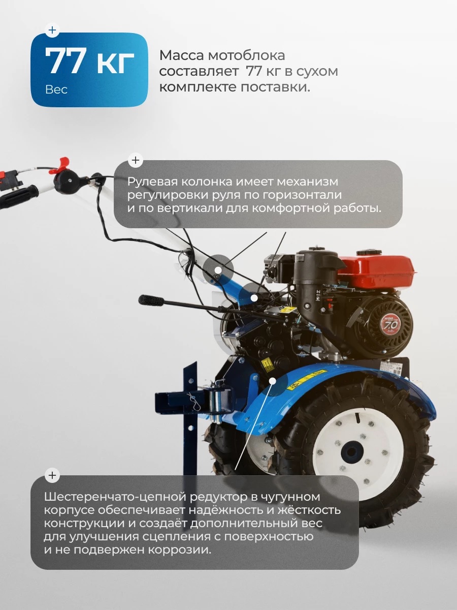 Коробка передач (3+1) — это манёвренность в тесном огороде и удобство на разворотах. Загнал в угол? Не беда — включил реверс и поехал обратно. Никаких танцев с лопатой.