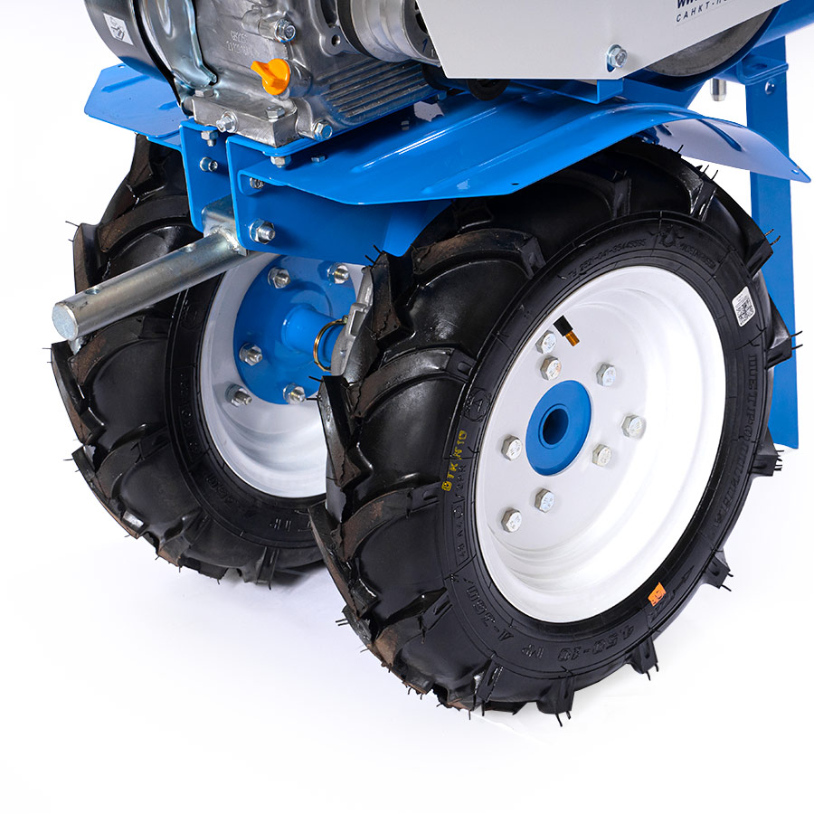 Комплектация: Закрылок 2 шт, Ключ свечной 1 шт, Ключ имбусовый 1 шт, Фреза-культиватор 4 шт, Пневматические колеса 4.50*10, Удлинитель полуосей 2 шт.