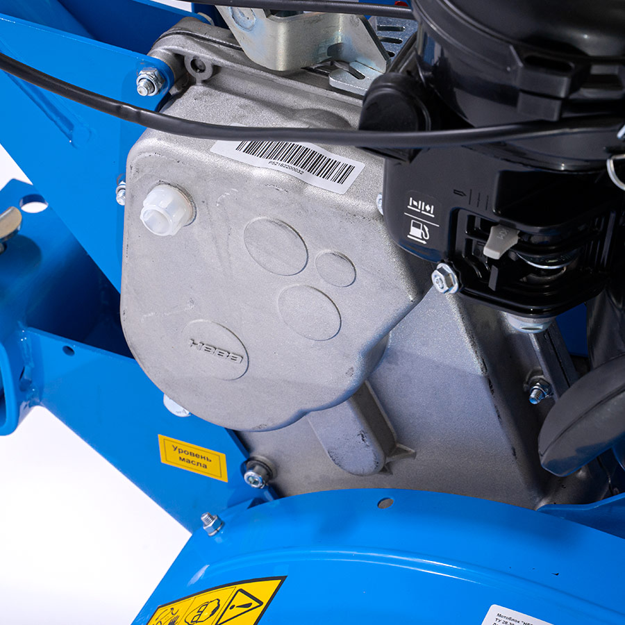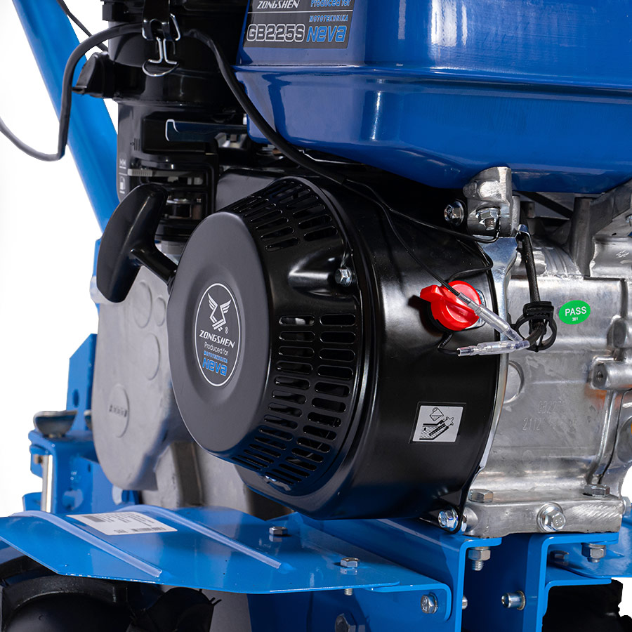Мотоблок оснащен бензиновым двигателем Zongshen GB225 — это четырехтактный, одноцилиндровый двигатель с воздушным охлаждением. Имеет конструкцию верхнего клапана (OHV) и чугунные гильзы, которые повышают надежность основных узлов. Мощность двигателя 7,5 л.с.