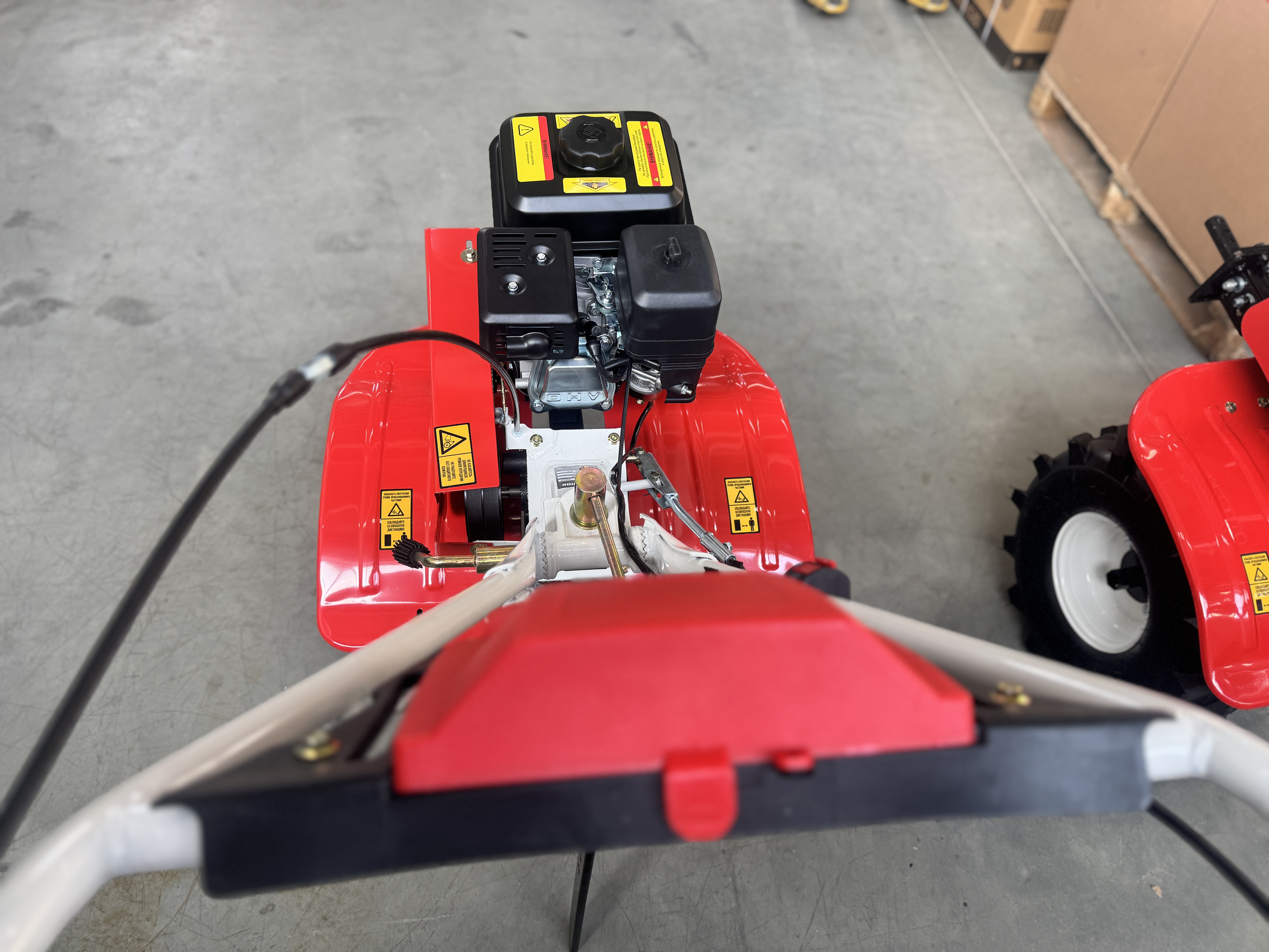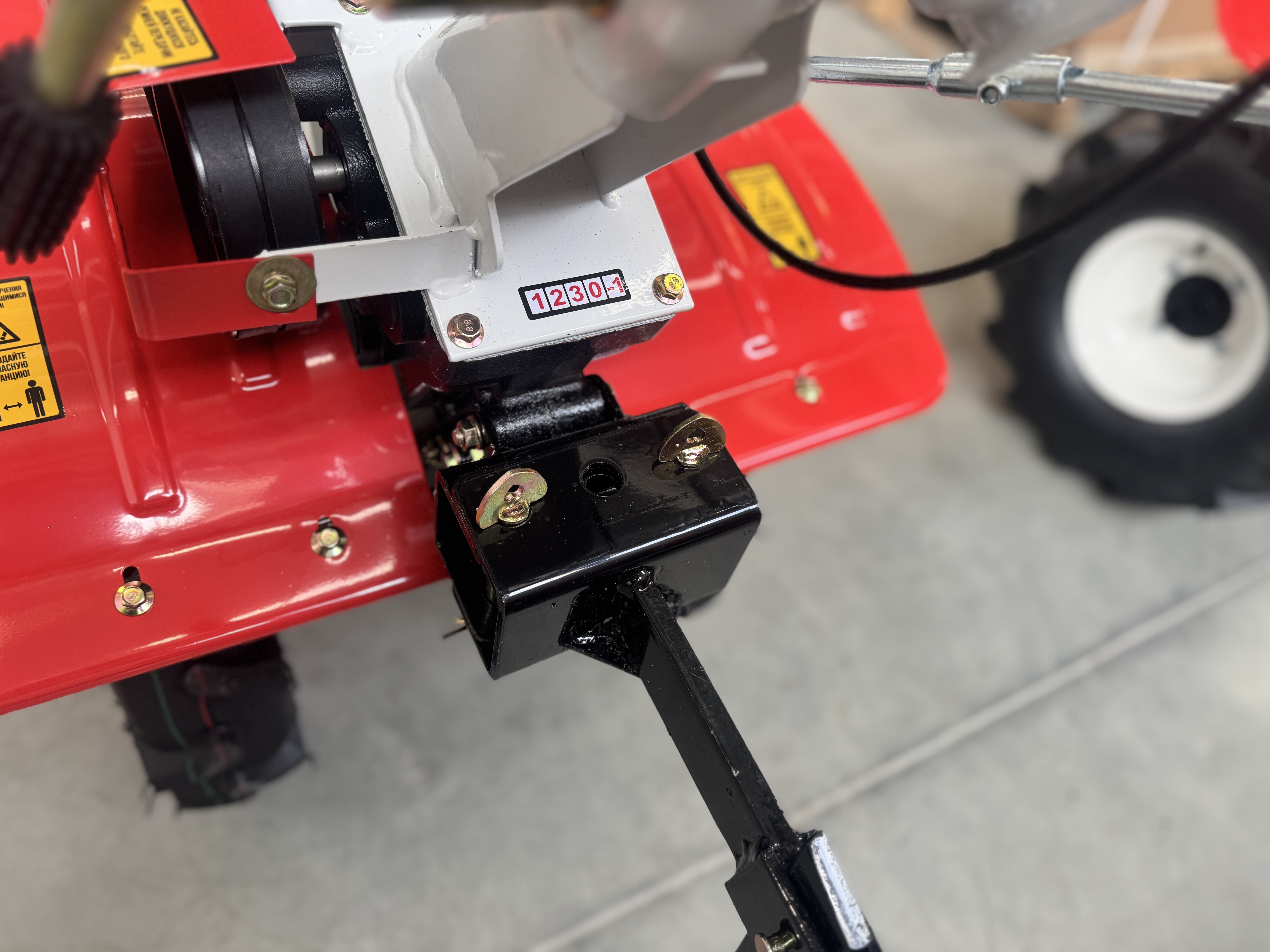У МБ‑5 — серьёзный арсенал для тяжёлых работ. Четырёхтактный бензиновый двигатель 170F (212 см³) выдаёт 7 л. с. (5150 Вт). Редуктор — чугунный, шестерёнчато‑цепной: не то что алюминиевый, прослужит годами. Три скорости вперёд (первая — пониженная, 1–1,5 км/ч) и одна назад позволяют точно подбирать режим под задачу: вспашка, окучивание или перевозка груза до 500 кг. Колёса 4×10 с агрессивным протектором держат сцепление даже на мокром склоне.