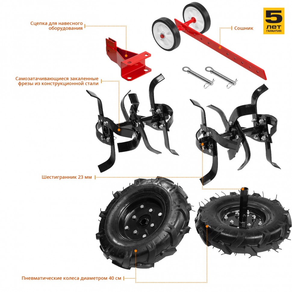 Мощный 4‑тактный двигатель (7 л. с., 212 см³) — справится и с целиной, и с тяжёлой глиной.