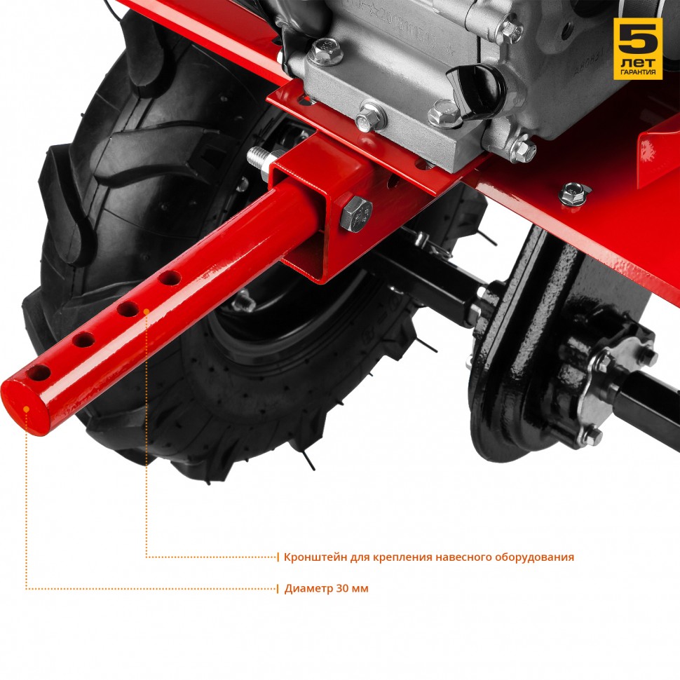 Универсальная сцепка (диаметр 30 мм) и шкив отбора мощности — подключайте навесное: снегоуборщик, щётку, роторную косилку. «Один в поле не воин, а с навеской — сила!».