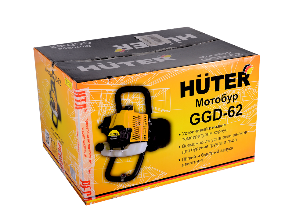 Мотобур HUTER GGD-62 – устройство, нашедшее широкое применение в строительных работах, на дачных участках и в зимней рыбалке. Это самая мощная модель в линейке, что позволяет получить уверенность в том, что аппарат справится с твердым льдом и грунтами.