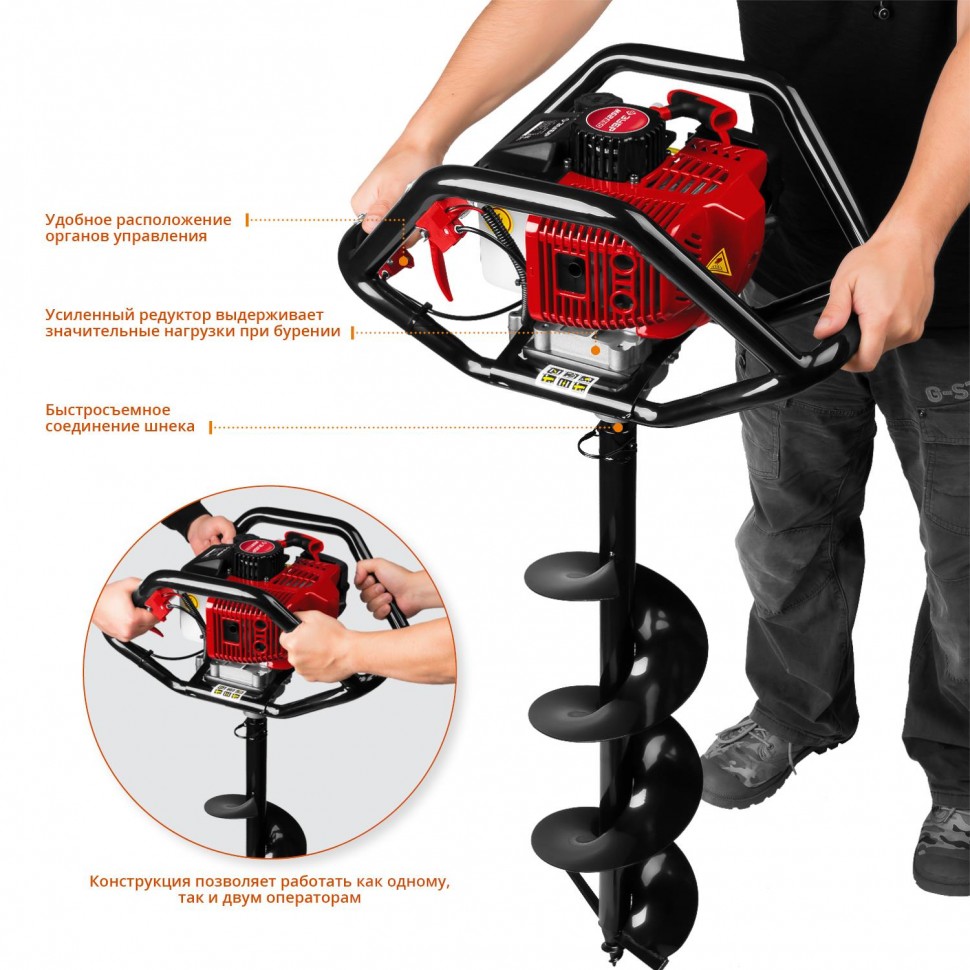 Удобство для двоих. Конструкция с двумя рукоятками позволяет работать как одному, так и двум операторам одновременно. Это не только повышает эффективность бурения, но и снижает нагрузку на каждого из вас.