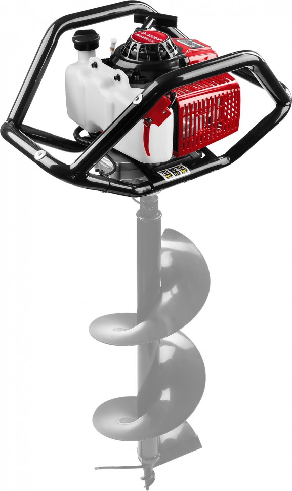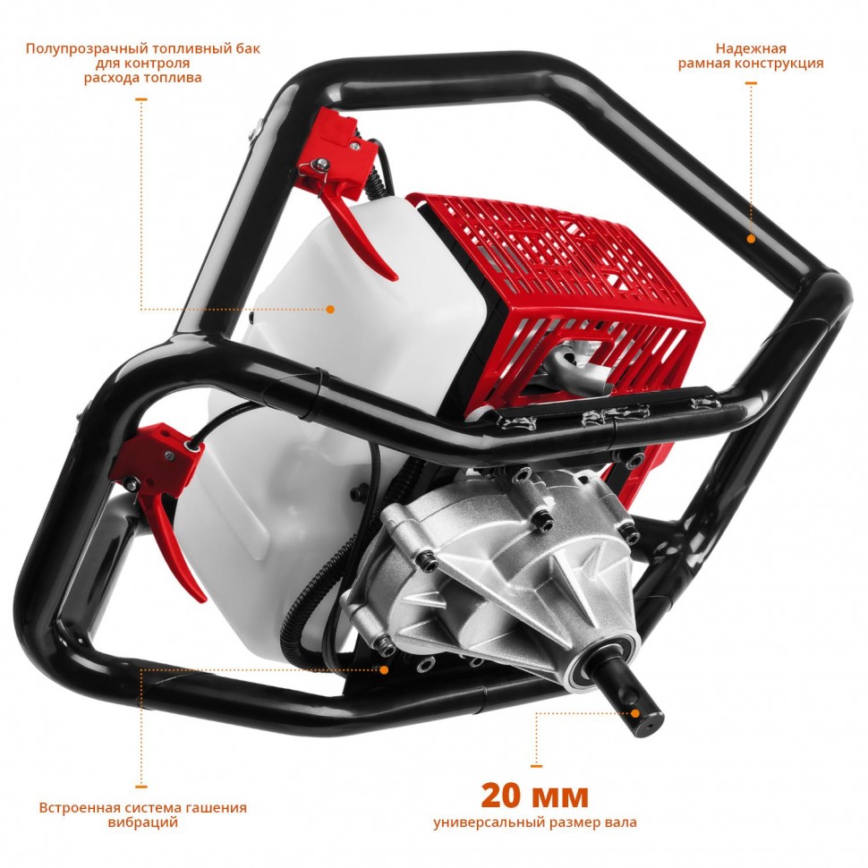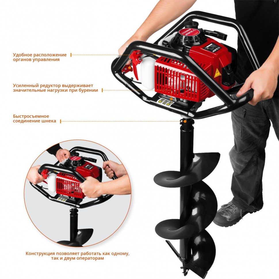 Мощность, внушающая уважение. Двухтактный бензиновый двигатель (2,4 кВт / 3,26 л. с., объём — 71 см³) уверенно справляется с бурением мягких, твёрдых и мёрзлых грунтов, а также льда. Это инструмент для тех, кто не привык отступать перед сложностями.