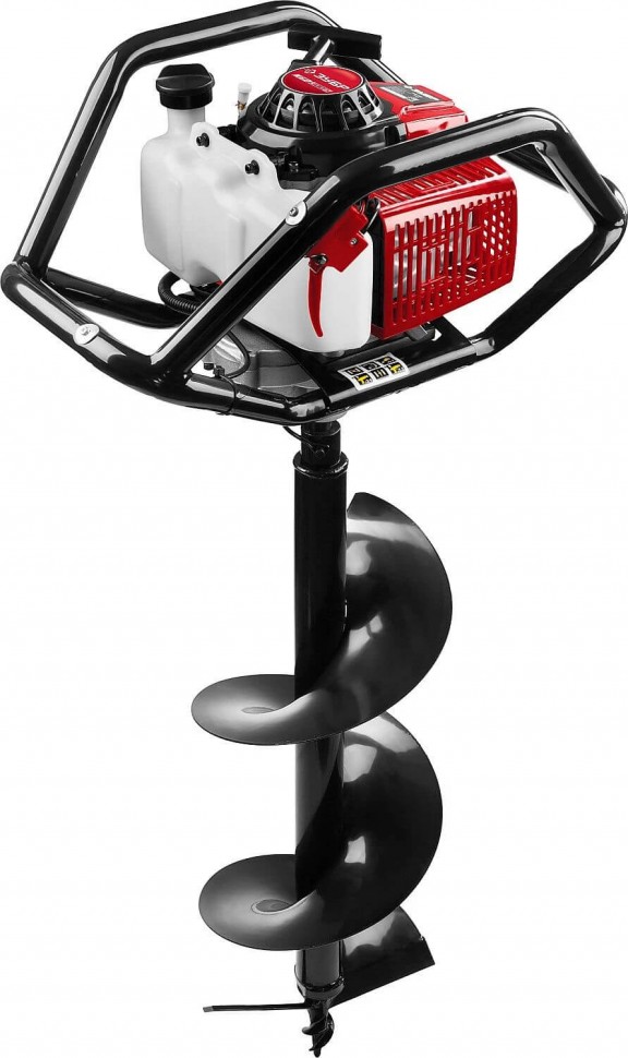 Мощь под капотом. Двухтактный бензиновый двигатель (3,26 л. с. / 2,4 кВт, объём — 71 см³) тянет как надо. Частота вращения — 8 800 об/мин: бурит ровно, без провалов. С таким мотором не страшно взяться за скважину или столбы для забора.