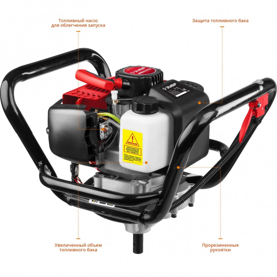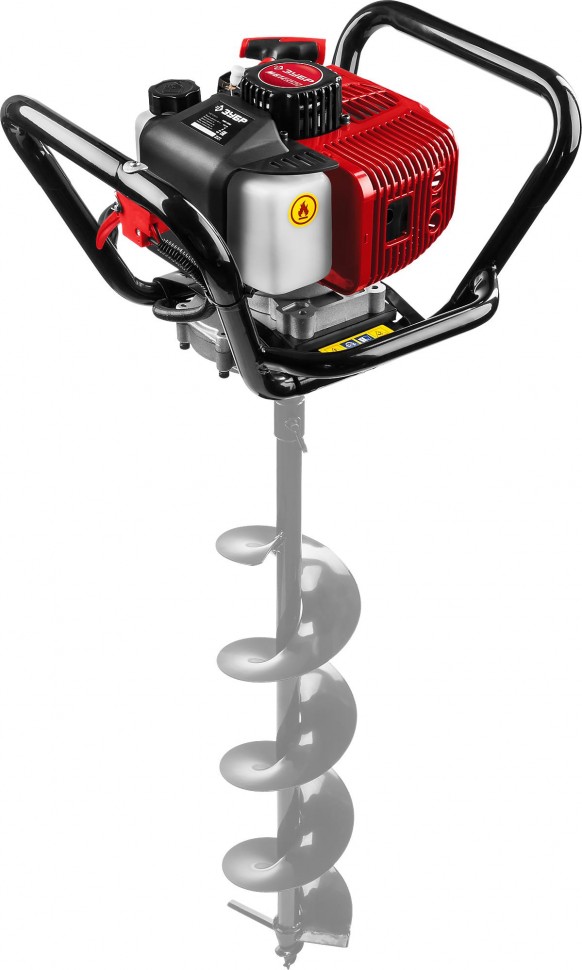 Двигатель — зверь: 2,45 л. с. (1,8 кВт), 2‑тактный, объём 52 см³. Бурит всё: мягкий грунт, твёрдый, мёрзлый, лёд. Никаких «не получилось».