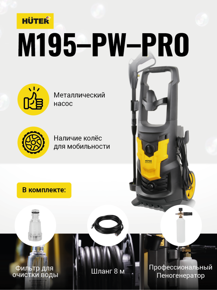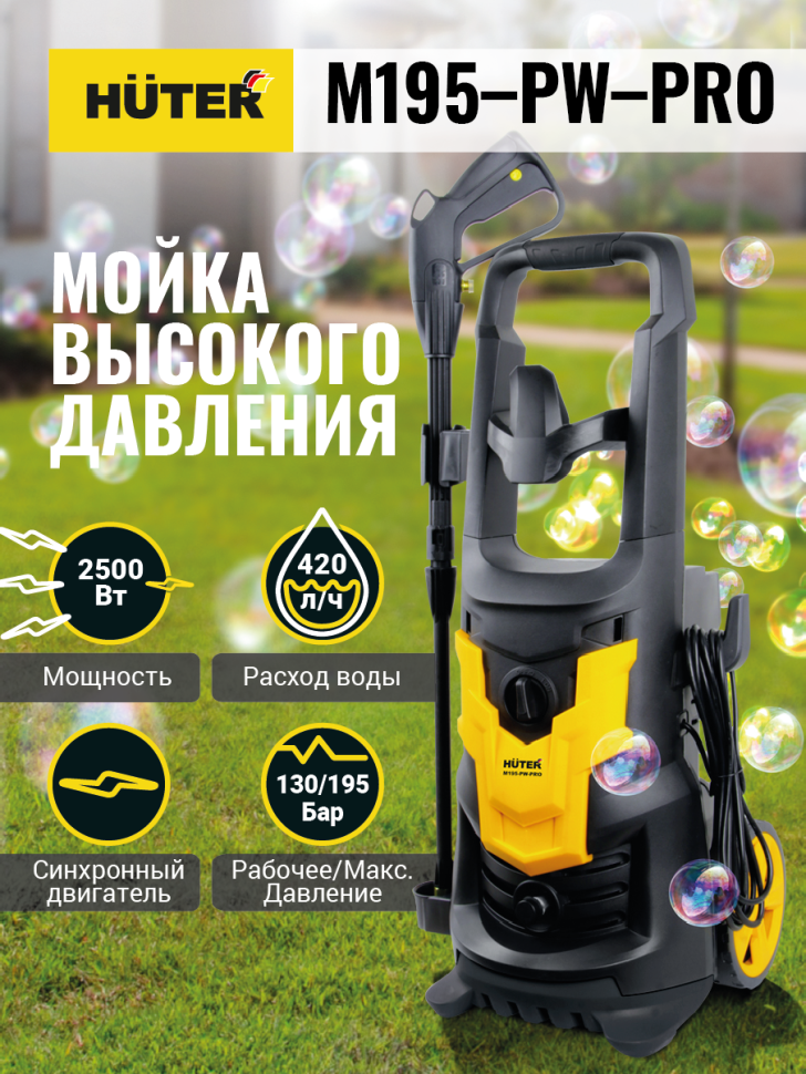 Модель Huter M195-PW-PRO имеет синхронный щёточный двигатель мощностью 2500 Вт. с воздушной системой охлаждения. Рабочее давление мойки - 130 бар, максимальное - 195 бар. Средний расход воды составляет 420 литров в час.