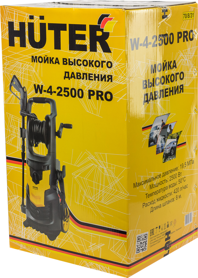 Мойка высокого давления размещена на колесиках и легко перемещается по поверхности. Комплектующие мини-мойки изготовлены из качественных, износостойких материалов. Huter W-4-2500 PRO - это надежная и мощная модель, которая справится с любым загрязнением.