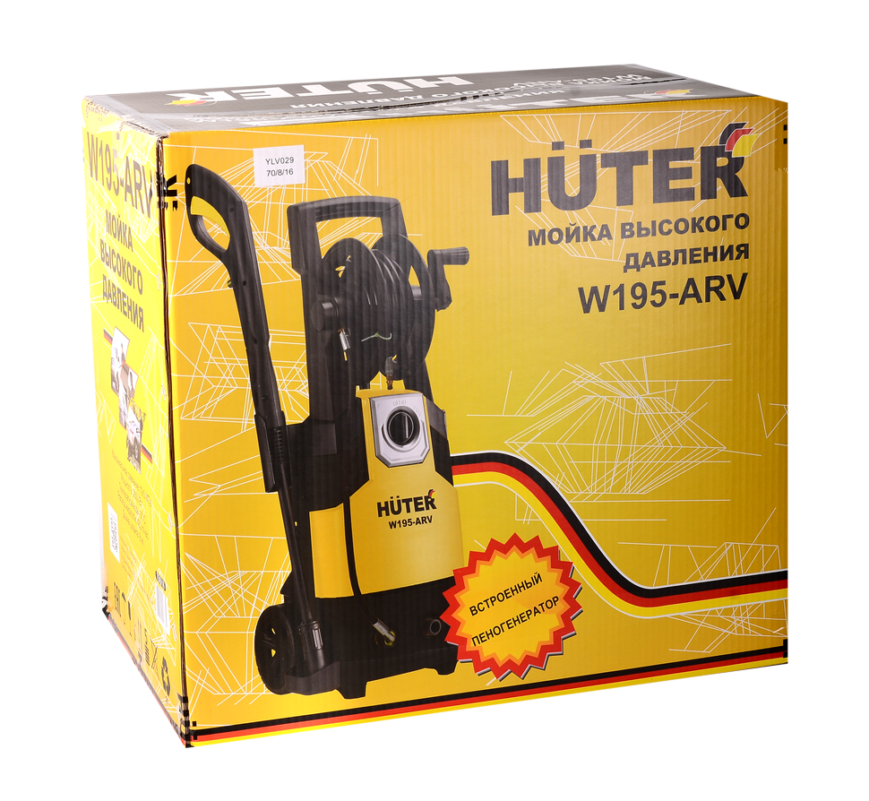 HUTER W195-ARV — мойка высокого давления, предназначенная для очистки от загрязнений автомобилей, мотоциклов, велотехники, сельскохозяйственных агрегатов, а также элементов фасадов зданий.
