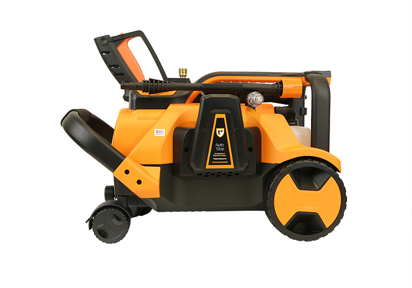 В конструкции мойки предусмотрено 4 колеса: 2 основных для перемещения в вертикальном положении за ручку и 2 дополнительных поворотных для перемещения в горизонтальном положении за шланг в след за пользователем