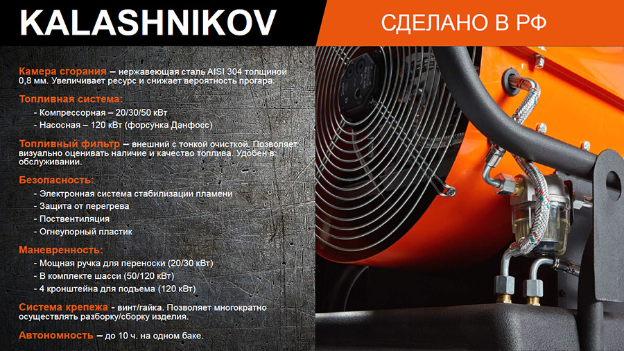 KALASHNIKOV — один из самых известных российских брендов в мире. Сегодня под этим брендом в том числе производится и продукция гражданского назначения, а именно — тепловое оборудование для бытового и коммерческого применения.