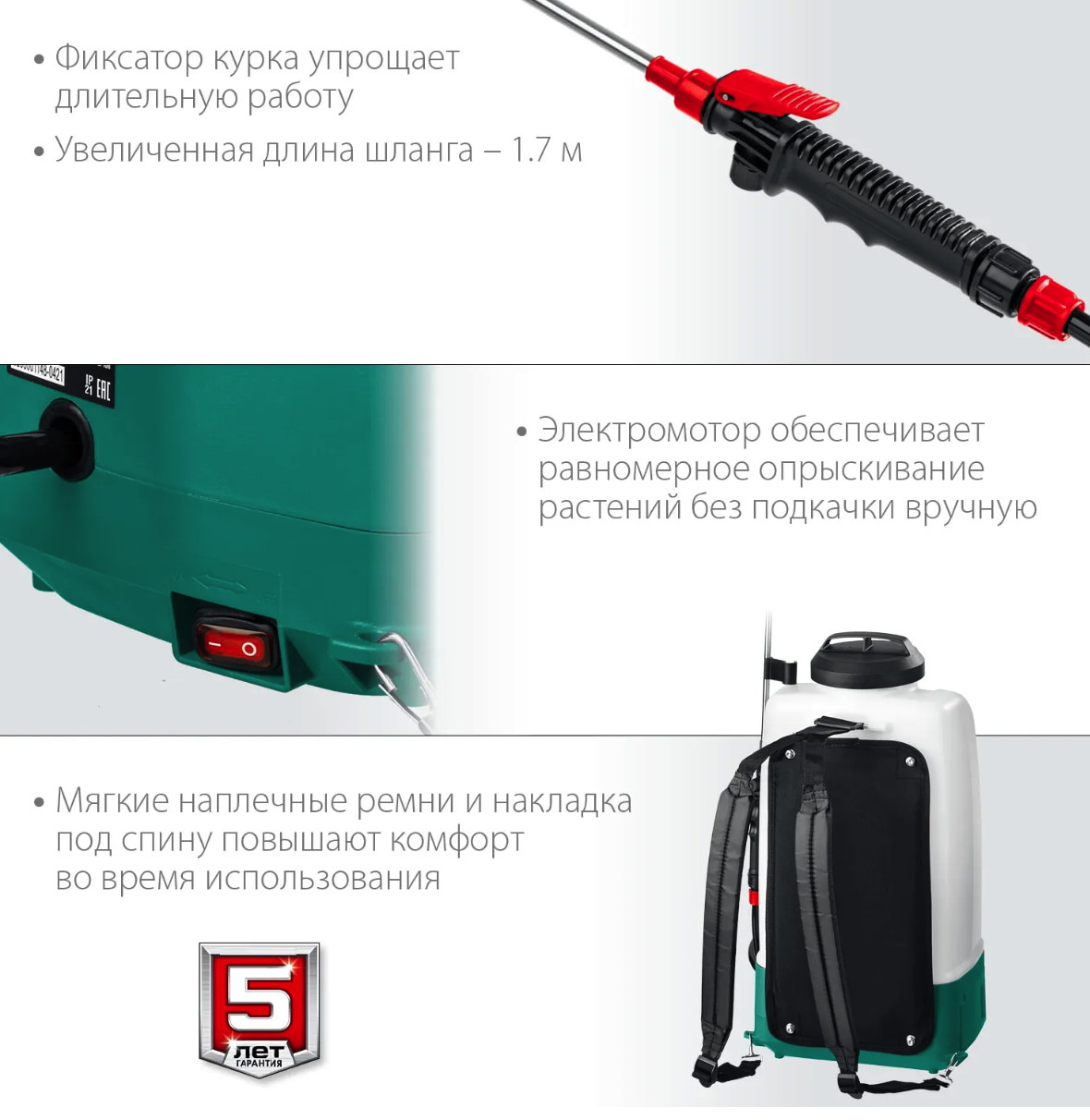 Ранцевая конструкция — бережём силы. Эргономичные ремни распределяют вес (4,2 кг без аккумулятора), так что спина не устаёт даже после долгой работы. Меньше усталости — больше продуктивности.