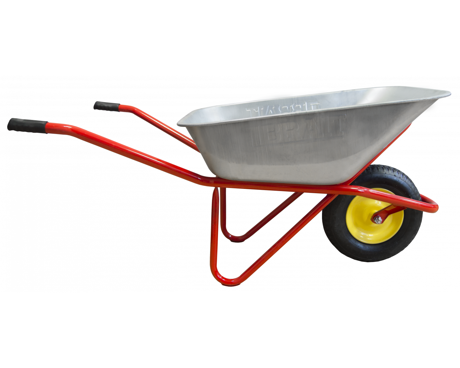 Тачка строительная одноколесная BRAIT200 (пневмо) с оцинкованным корытом емкостью 110 литров и грузоподъемностью до 220 кг кг. Тачка предназначена для тяжелых работ на строительной площадке и в саду. На тачке можно перевозить различные грузы: строй материалы, дачный мусор, дрова для печи, мебель. За счет особой конструктивной формы тачка выдерживает большие нагрузки 220 кг.