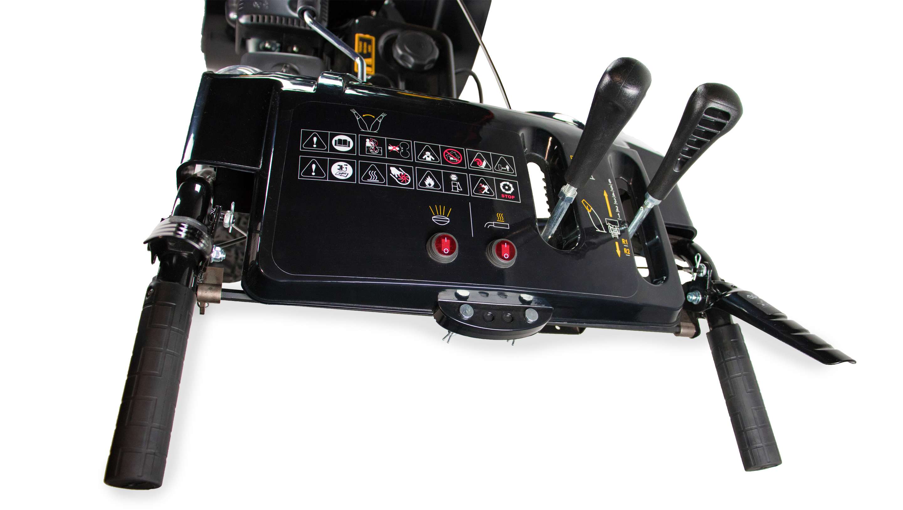 Регулировка положения угла выброса снега и положения желоба производится на панели.