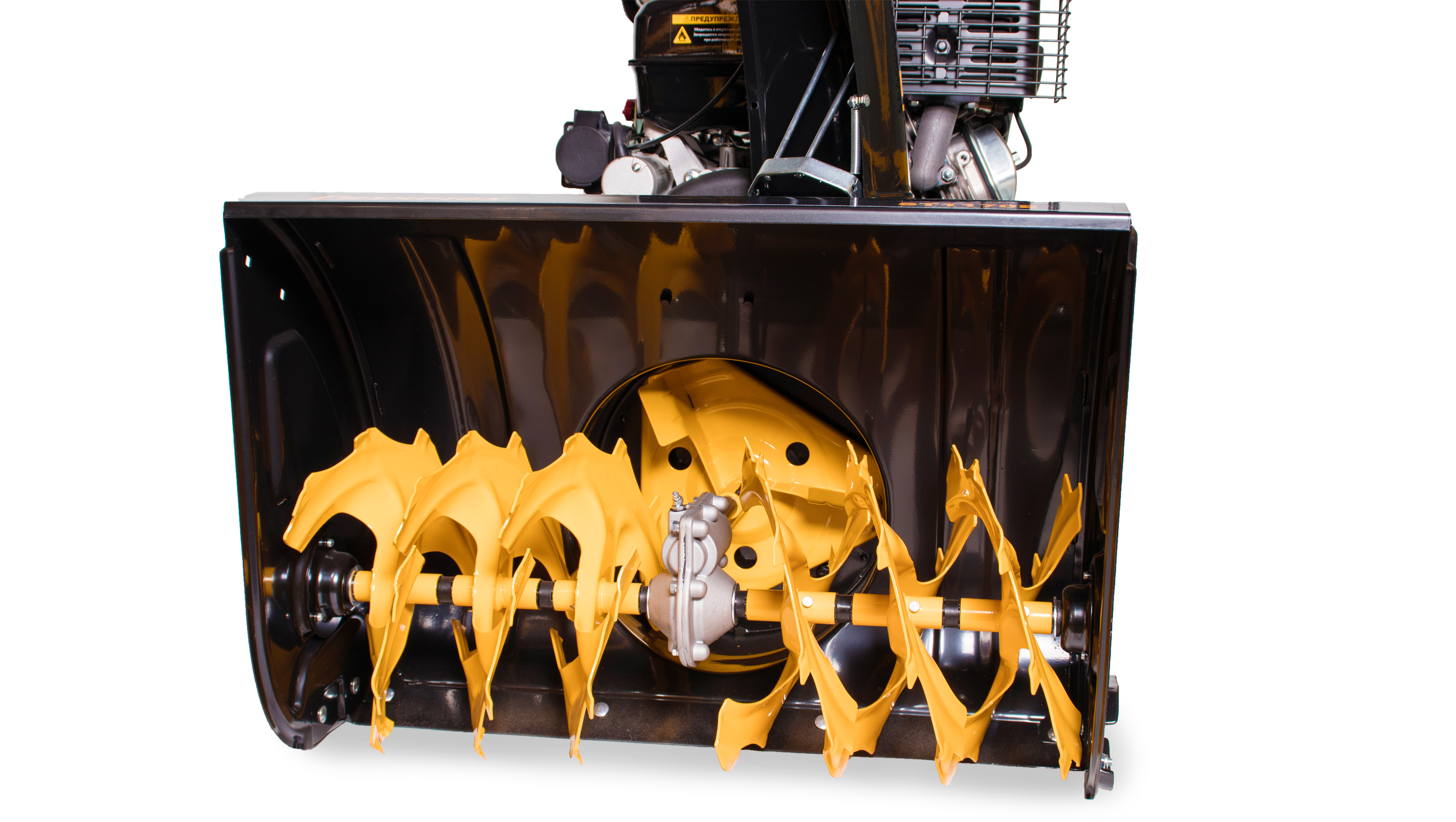 Широкий захват позволяет быстро очищать большие открытые территории. Износостойкий патрубок способен изменять направление выброса снега, управление им совершается непосредственно с места оператора. Там же находятся органы управления другими механизмами, в том числе оборотами двигателя. Удобные рукоятки снижают нагрузку на руки, поэтому даже длительная работа не вызывает серьезной усталости.