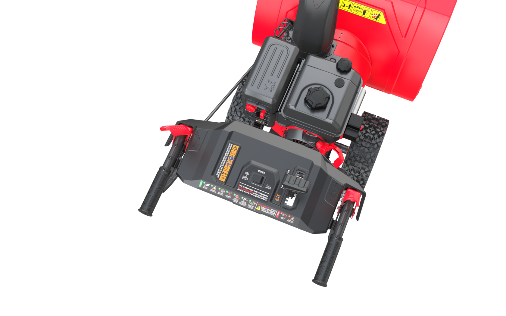 Двухступенчатая система захвата и подачи обеспечивает дальность выброса снега до 12 метров. Специализированный зимний двигатель рабочим 224сс гарантирует запуск и беспроблемную работу при морозах до –30 °С. Также, для комфортной продолжительной работы на морозе, предусмотрен подогрев ручек оператора и две передние LED фары.