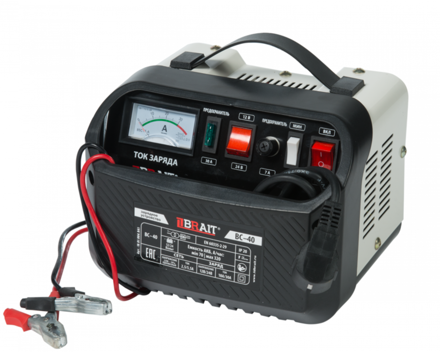 Зарядное устройство BRAITBC-40 Может зарядить батарею ёмкостью 80\320 Ач. У зарядного устройства есть защита короткого замыкания, защита обратного подключения, защита низкого напряжения. С учетом состояния заряжаемой батареи применяется быстрая либо плавная зарядка. Увеличивает время работы аккумулятора. Уменьшает долю потери электролита, устраняя нагрев батареи.